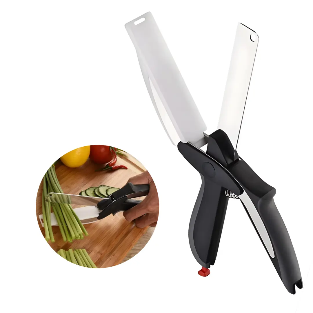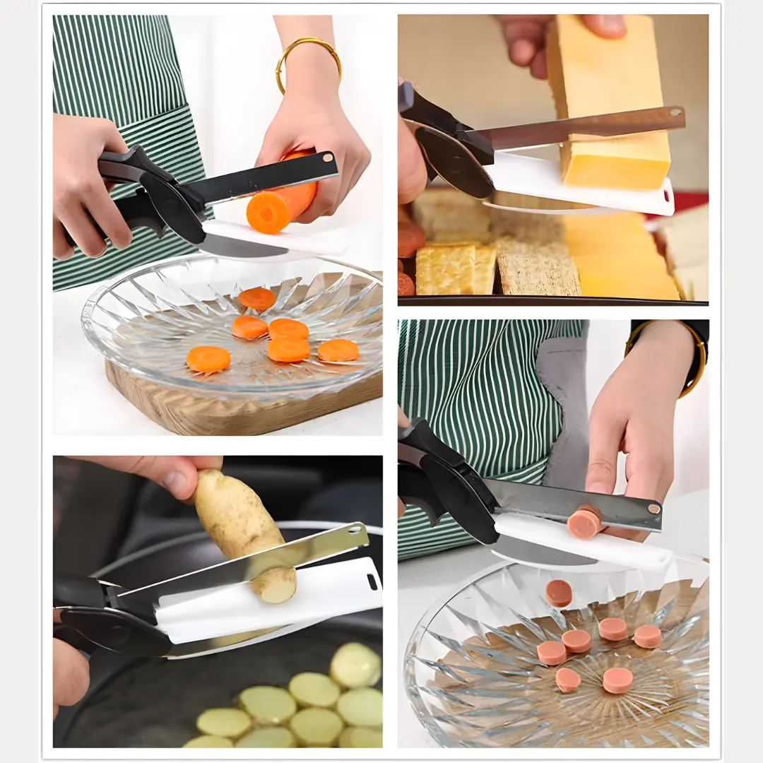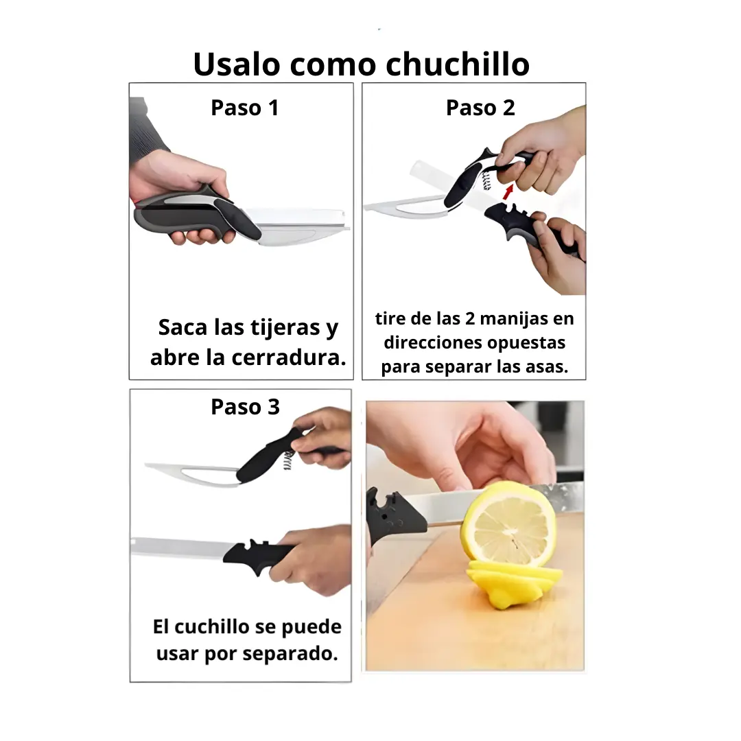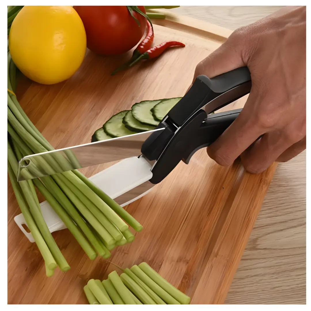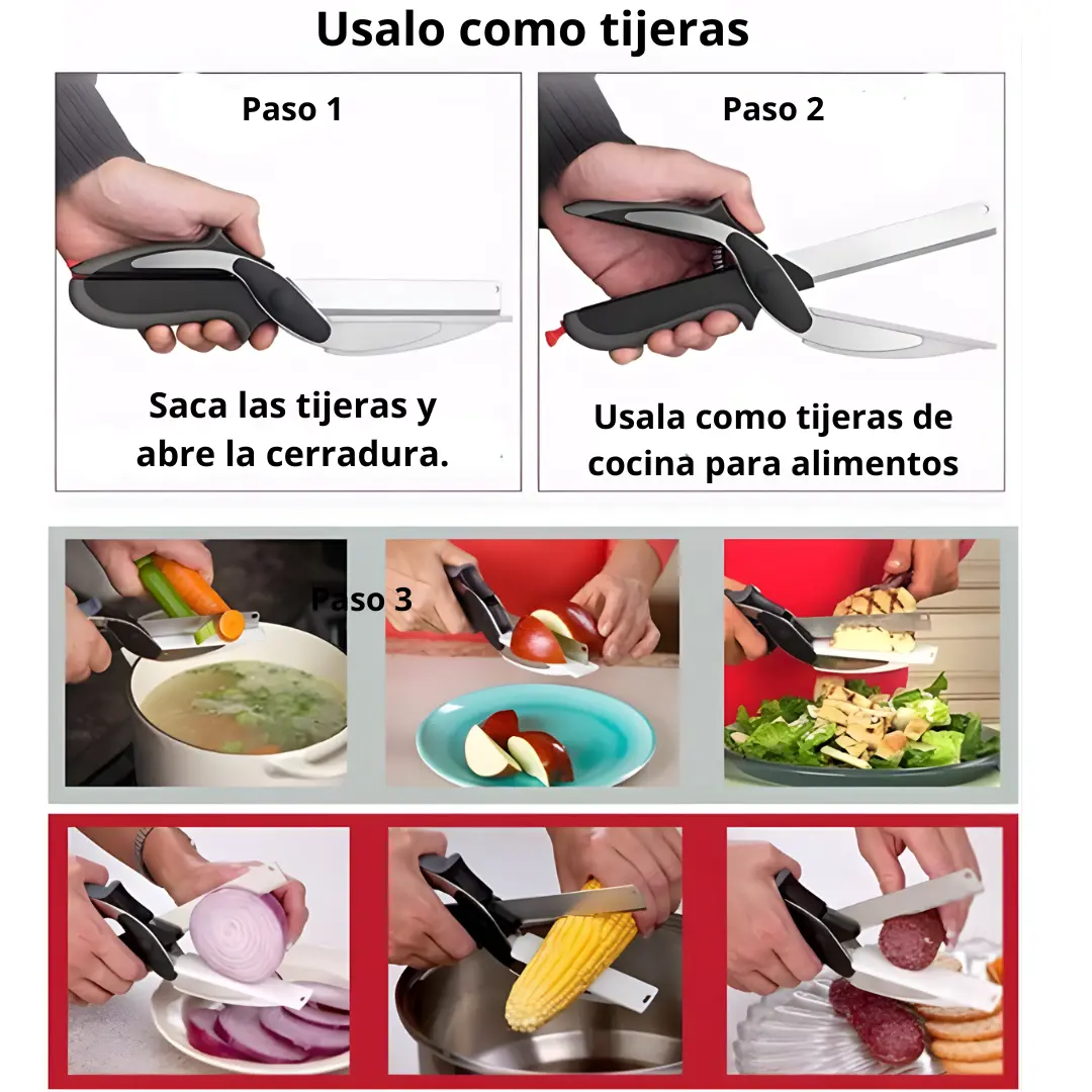 El Clever Cutter está diseñado para cortar todo tipo de alimentos en segundos: verduras, frutas, carnes, quesos, pan y más. Gracias a su sistema tipo tijera, puedes realizar cortes precisos con una sola mano, sin necesidad de usar cuchillos adicionales ni tablas de picar tradicionales.